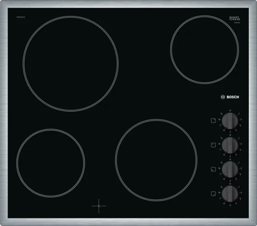 Bosch 4 Electric Glass Ceramic Hob PKE645CA2E is a 60 cm built-in electric ceramic hob from Bosch’s Series 2 range, featuring a sleek black glass-ceramic surface with a stainless steel frame and four cooking zones.