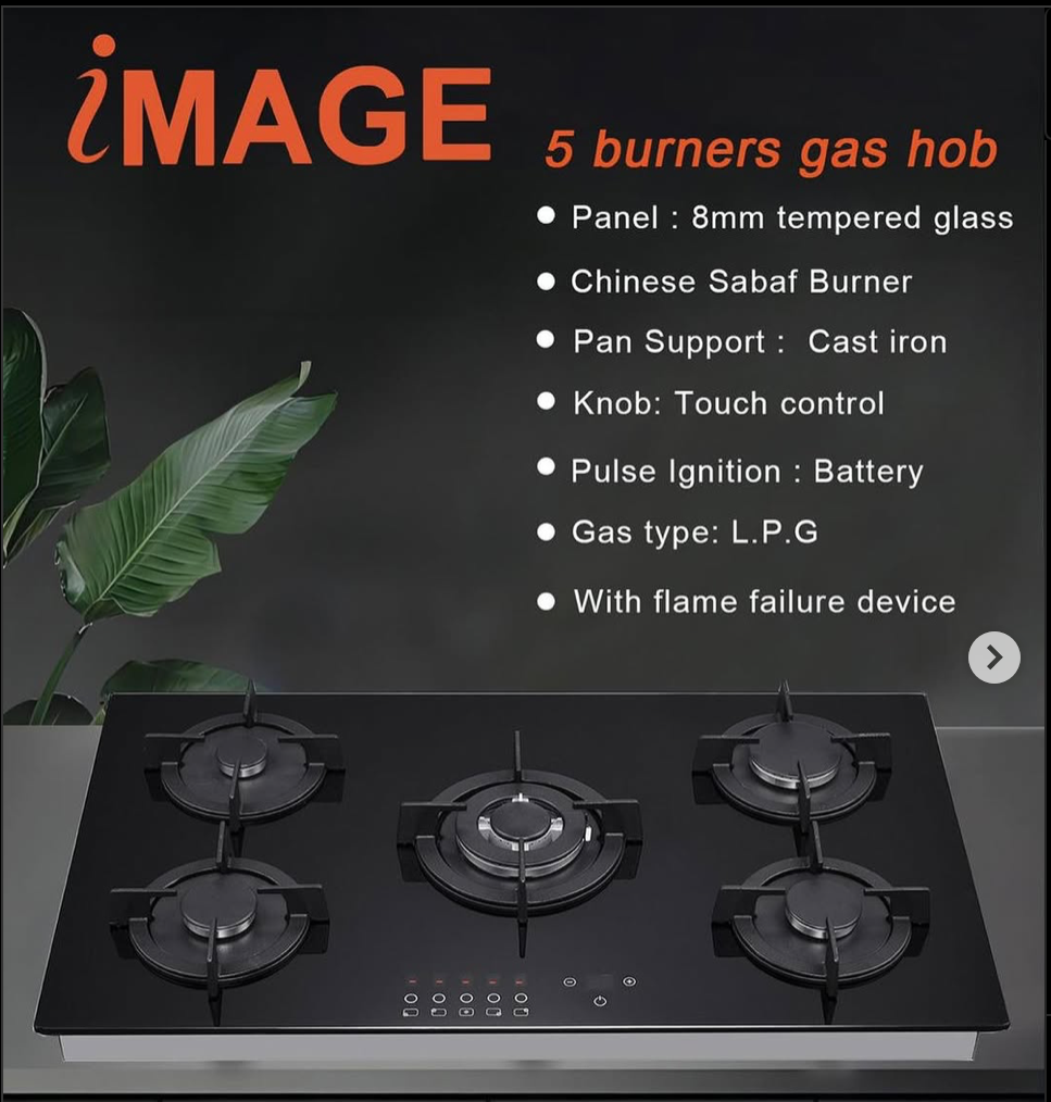 iMAGE 5 Burner Bult in Gas Cooker IM-09A1 is a premium kitchen appliance designed to deliver powerful cooking performance and modern style. With its five-burner configuration, this built-in gas hob allows you to cook multiple dishes at the same time, making it ideal for large families and busy kitchens. Its sleek black tempered glass surface adds elegance to your kitchen while providing durability and easy cleaning.