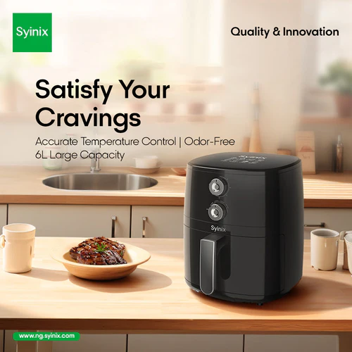 Syinix 6L 1450W Air Fryer SAIF 55E, this 6-litre air fryer is meticulously engineered for the health-conscious gourmet who refuses to compromise on taste or texture.