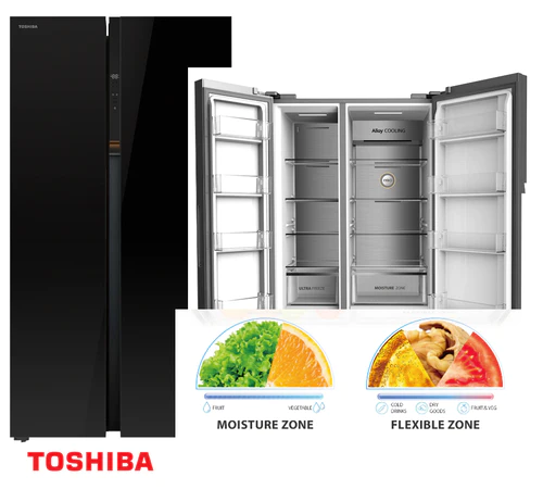 TOSHIBA FRIDGE 592L SBS BLACK GR-RS780WE-PGF are inverters wherein the fan automatically senses changes in the cooling capacity of the compressor and adjusts speed in 4 levels along with Max-humidity fresh drawer it is also equipped with a normal humidity-adjustable crisper which helps to store large amounts of fruits and vegetables.